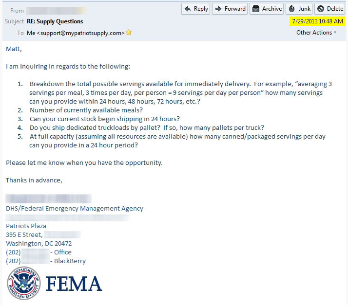 I’m not one to cry that the sky is always falling, but when DHS/FEMA make a move to quietly buy up emergency food supplies and ask how much we can ship within 24 hours…I think this is far enough outside the realm of what is “normal” to beg some questions.