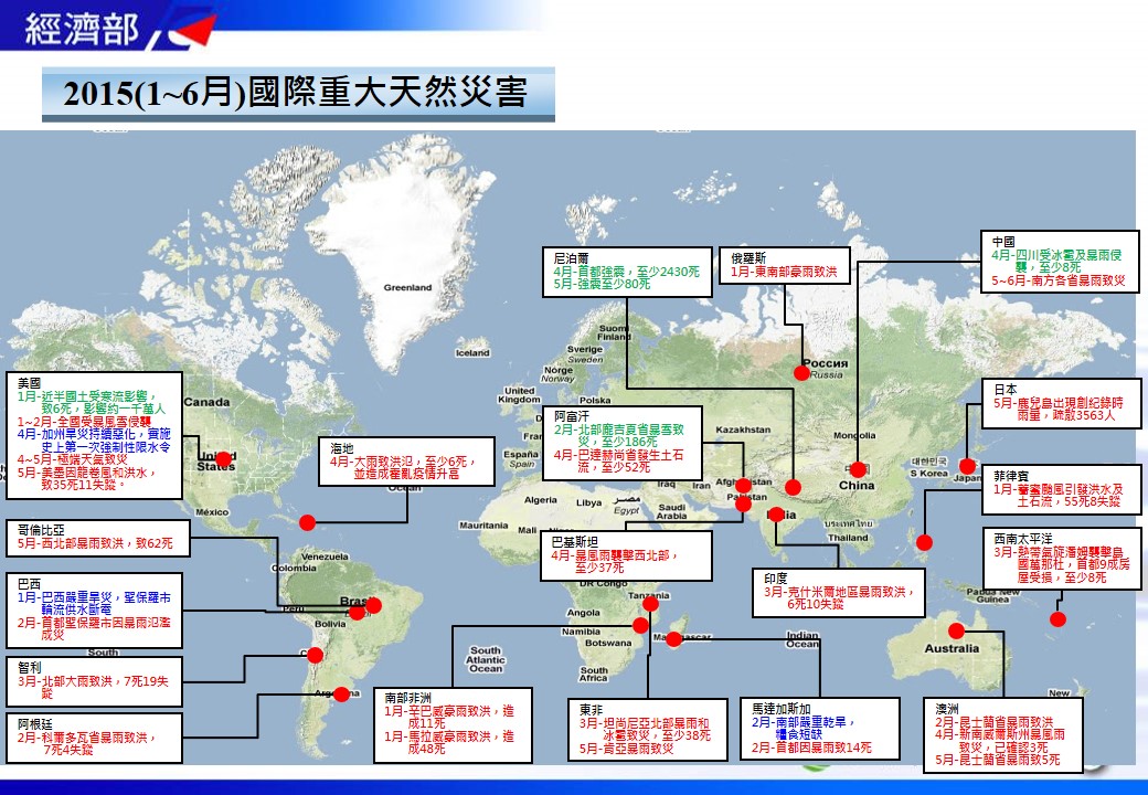 近來履見全球各地有重大水旱災的新聞,附上2015全球水旱災的統計圖,近日嚴重的水災發生在美國德州: