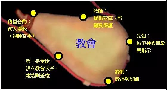 所以在身體中這五種重要器官:第一是「使徒」,神賜給教會來設立次序,並帶有「神的權柄」;「先知」則帶給教會「神的異象」;「教師」給予「神的教導與命令」;「牧師」給予「神的安慰與照顧」;「傳福音的」釋放出「神的大能」。(如下圖所示)