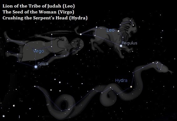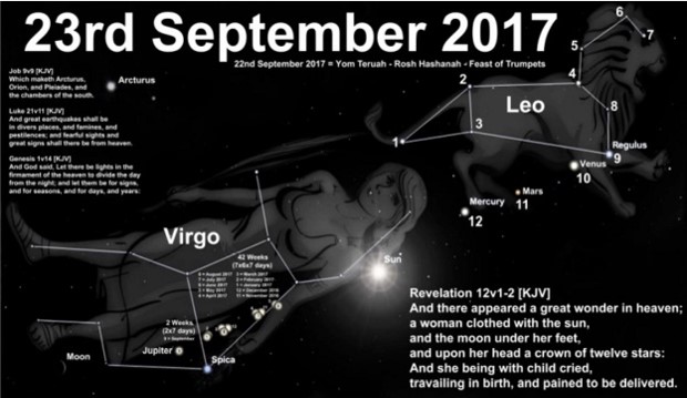 而在2017年9月23日,(是以色列進入耶路撒冷的50週年。 5777 年9之後也是以色列立國70週年)處女座星群在耶路撒冷上升起, 那時這個天文奇跡出現,她身穿太陽,腳踏月亮,頭上有12星星組成冠冕,(它們是:Benebola獅子座β,Chertan獅子座θ ,Zosma獅子座δ,Algieba獅子座γ,Adhafera獅子座ζ ,Rasalas獅子座μ, Al Asad 獅子座κ ,Algenubi獅子座ε,Regulus獅子座α,Venus,Mars,Merchury)