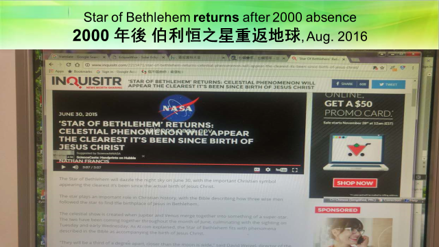 路21:25-26 各大媒體都爭相報導,很多天文學家都一致認同,這就是聖經中記載過,在兩千年前出現過的「伯利恆之星」,首先在2015年6月30日開始亮相,金星和木星聚和時候,旁邊穿線, 木星:帝王之星, REGULUS. 然後在2015年10月26日再現,到2016年8月27日金星和木星幾乎完全重疊在人類眼前,發出燦爛輝煌的閃爍光芒!