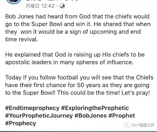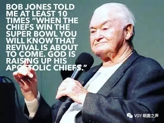 鲍勃琼斯曾经对Shawn Bolz说了至少10次,“当酋长队夺得超级杯,你就会知道大復兴即将来临,神会兴起祂的使徒性领袖(酋长)!(来自Shawn Bolz脸书图片)