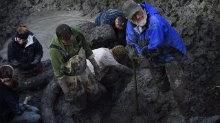 你从旁边走过时,可以看到一些‘木头’从永久冻土层里戳出来,但那些其实不是木头,而是勐犸像和其它远古时期动物的遗骨。”