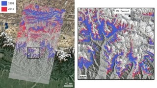 红色为新增植被在卫星传感器中,科学家发现在珠峰南坡4150 米以上的植被,拿2017年和1993年的图做对比,发现新增了许多植被。