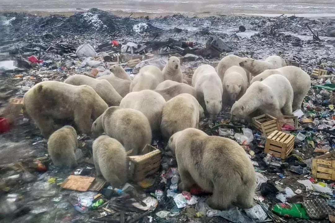 飢饿至极的北极熊,只好到人类的垃圾场里寻找食物。