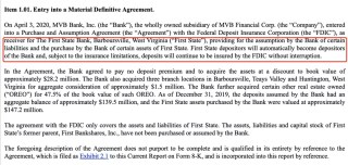 当地时间4月3日盘后,一家于纳斯达克上市的金融服务公司MVB Financial在一份声明中称,旗下全资子公司MVB Bank(下称MVB银行)收购了西弗吉尼亚州一家银行的存款和部分资产,后者被监管部门(美国联邦存款保险公司)宣布破产。