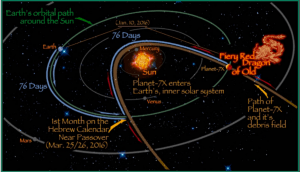 365天是绕着地球的轨道转的,它的轨道是绕另外一个黑色太阳系(NEMESIS)运行,这是一个椭圆形轨道,运行一周实际是3657年。地球围绕太阳公转,同样也是椭圆形轨道。因此当Planet-X靠近地球,会两次越过地球轨迹持续150天。