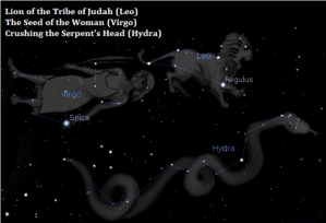 图片中有三个星群,处女座星群、狮子座星群、大蛇座小星群。这些星群,虽然仇敌很聪明地用这些来算命,但是星星、月亮、日头不是仇敌造出来的,而是Shen造的,Shen将一个星群这样安排因此才有这样的称呼。