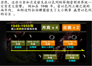 而1967年重新夺回耶路撒冷的时候,也是四次月食两次日食恰好落在犹太的节期里。2014年-2015年,当时军舰围困,联合国制裁耶路撒冷的时候也发生了四次月食两次日食的事件。