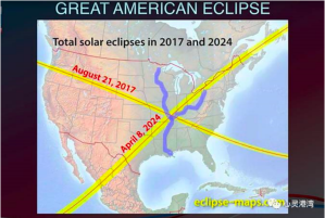 另一个重大的事件是2017年8月21号美国的超级日全食,在日食发生的地区会出现100%全部的黑暗,这还不够稀奇,真正的稀奇是7年之后它要发生同样的日全食,第一次发生的时候从西北方向交叉到东南,7年之后从东北方交叉到西南方,两个日食的交叉口恰好落在伊利诺州的小埃及地区,所以使得全世界关注这个日全食,7年对于Ji督徒来讲是一个非常有重要意义的日子。