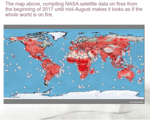 我这里有一副图:这个是2017年全球野火的数据图,里面有红色,橙色,黄色,是一种仪器检测火灾燃烧的位置和情况,图表示白色的像素越高的地方预表着这个火灾的次数,1000平方公里区域内会有多达100多次火灾等。