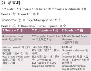Shen在《启示Lu》里强调7年的苦难,《启示Lu》有一个相似的模式,包括21项审判里面,在七印七号七碗,我们都会看到这样一个模式,每一段结束以后都会有大地震或者是流星,然后再来一个地震,这样一个模式。
