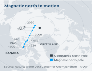 - 北极的磁场南移,北极正在以每年40英里的速度迁移向E罗斯;机场的指南针需要从新调整,(塔柏机场)已经转移3-4度了,北面正在大幅度偏移。