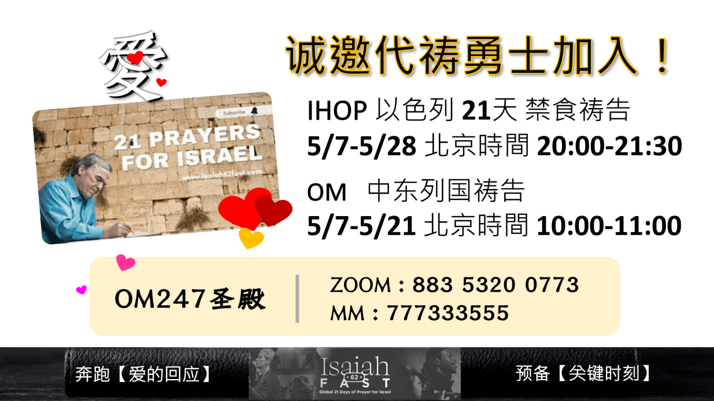 总部事工国际媒体部与IHOP连接,由Mike Bickle牧师领受以赛亚书62章为以色列祷告,目前全球已有上千家教会机构事工等共同回应,时间5/7-5/28祷告。