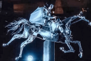 - 11分钟桥段 一位身穿银色铠甲的女骑士骑在银色金属马匹上, 驰骋在塞纳-马恩省河上。银色面具下, 是法国宪兵队准尉Floriane Lssert。